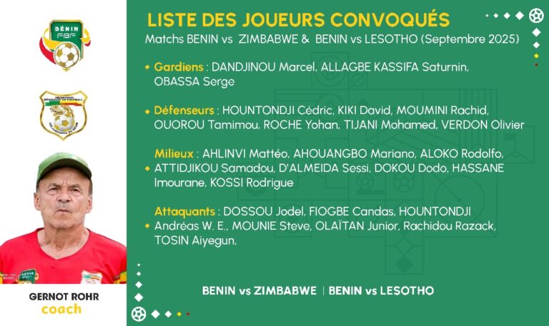 Le sélectionneur des Guépards du Bénin, Gernot Rohr, a dévoilé ce jeudi 28 août 2025 la liste des joueurs retenus pour les matchs des 7e et 8e journées des éliminatoires de la Coupe du Monde 2026.