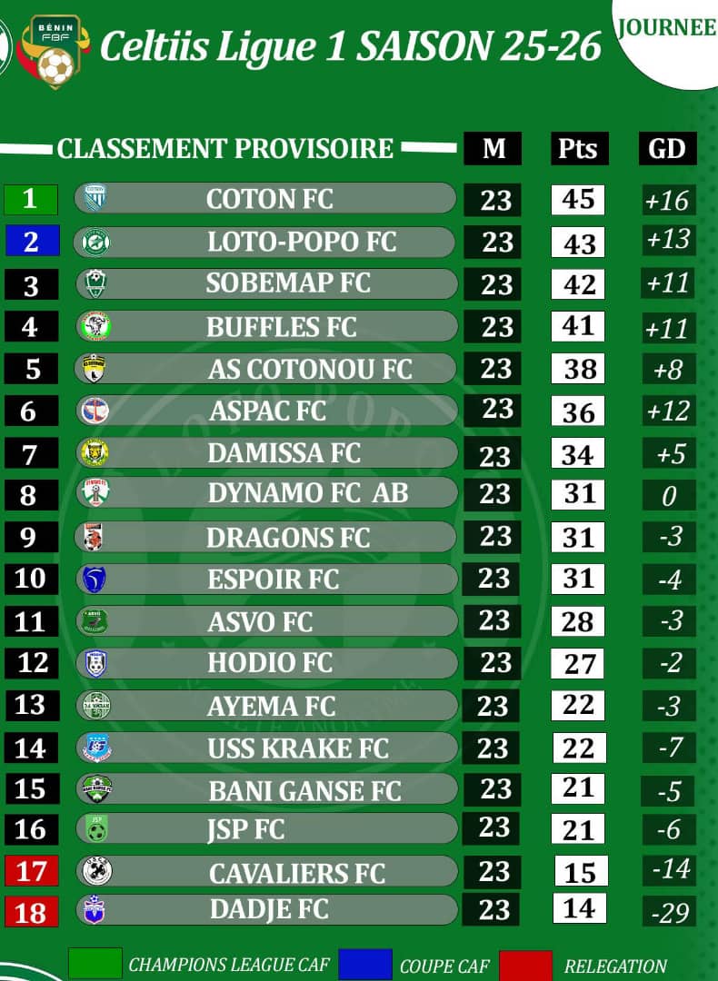 La 23e journée de la Celtiis Ligue 1, jouée ce week-end, a redistribué les cartes dans la course au titre. Coton FC reste solide leader, pendant que Loto-Popo s’offre une belle progression en grimpant à la deuxième place.