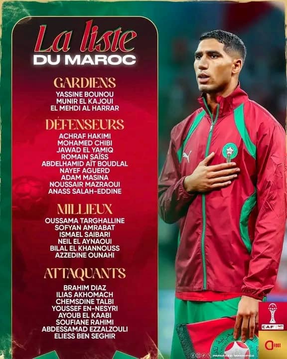 Bonne nouvelle pour les supporters : la star Achraf Hakimi, blessé depuis novembre, sera bien présente. Le défenseur du PSG figure parmi les 27 joueurs appelés. D’autres cadres sont également là , comme Nayef Aguerd, Sofyan Amrabat, Youssef En-Nesyri ou encore Romain Saïss, capitaine lors du Mondial 2022.