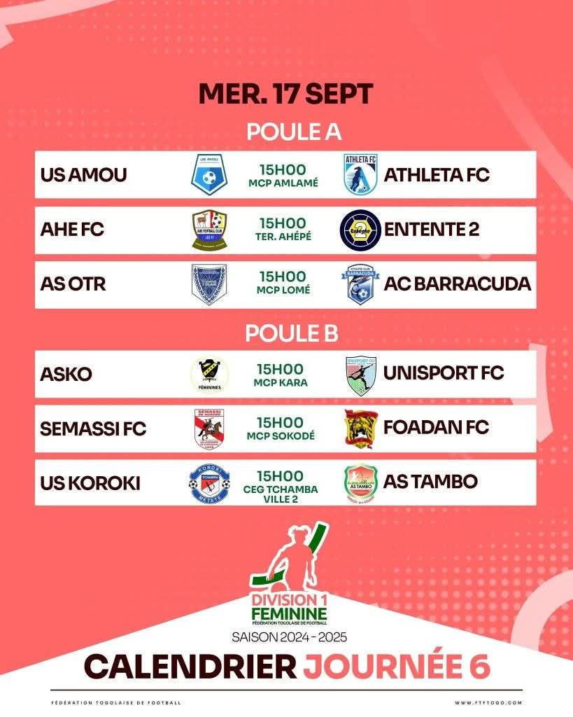 La 6e journée du championnat national de première division féminine se joue ce mercredi 17 septembre 2025 sur plusieurs stades du pays. Huit rencontres alléchantes sont au programme, réparties entre les poules A et B, avec un coup d’envoi fixé à 15h00 sur tous les terrains.