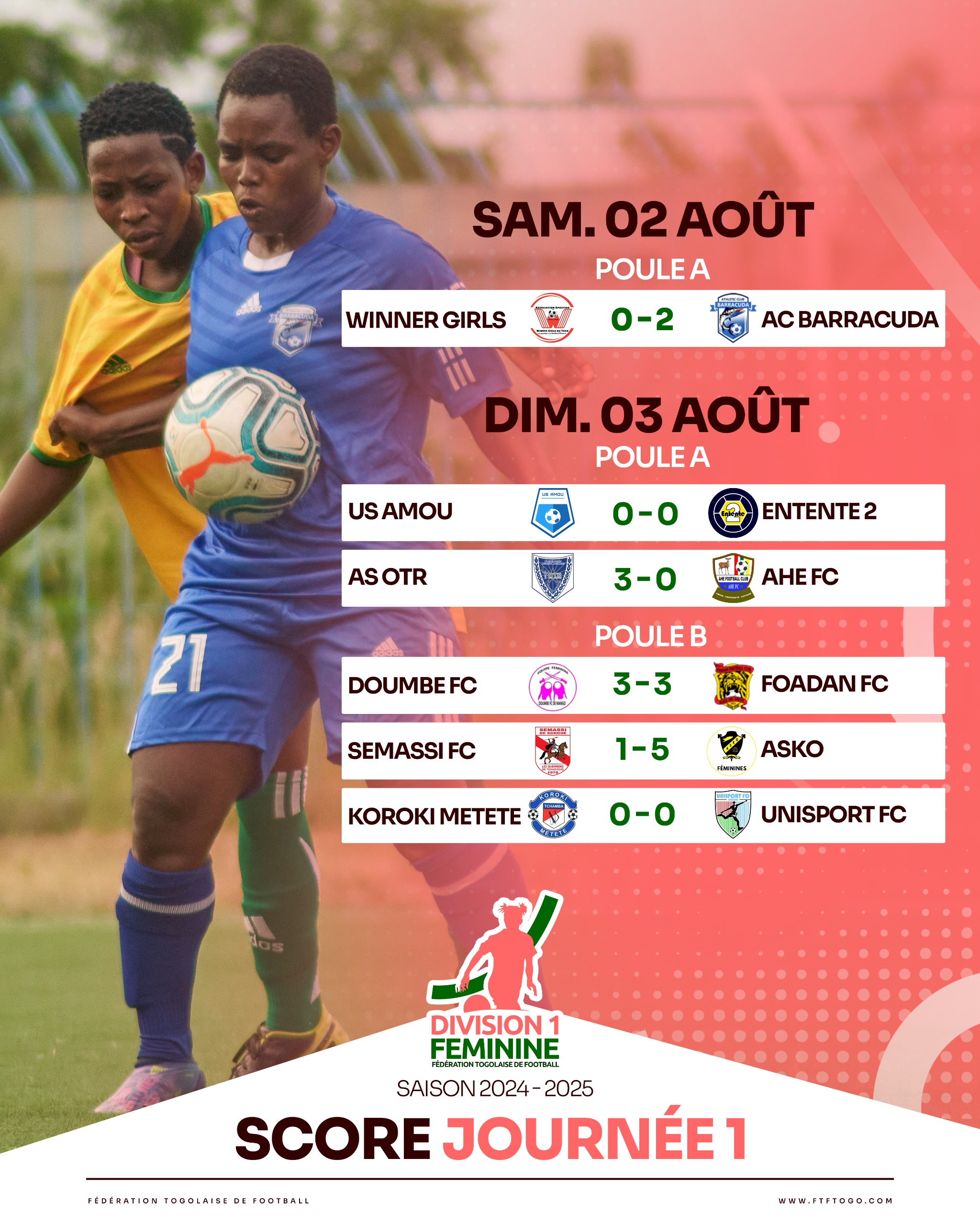 Dans la poule A, lors du match d’ouverture samedi 2 août 2025, l’AC Barracuda de Lomé a ouvert le bal en allant dicter sa loi à Notsè face à Winner Girls de Notsè ,2-0, grâce à des réalisations d’Akou Azinogo et Victoire D’Almeida.