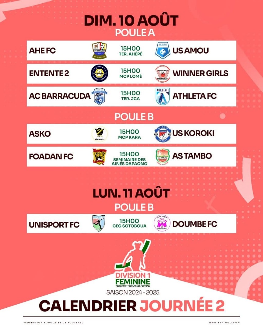 La journée deux du championnat national de première division féminine, D1 Féminine), se joue ce dimanche 10 et lundi 11 août 2025 sur différents terrains du Togo.