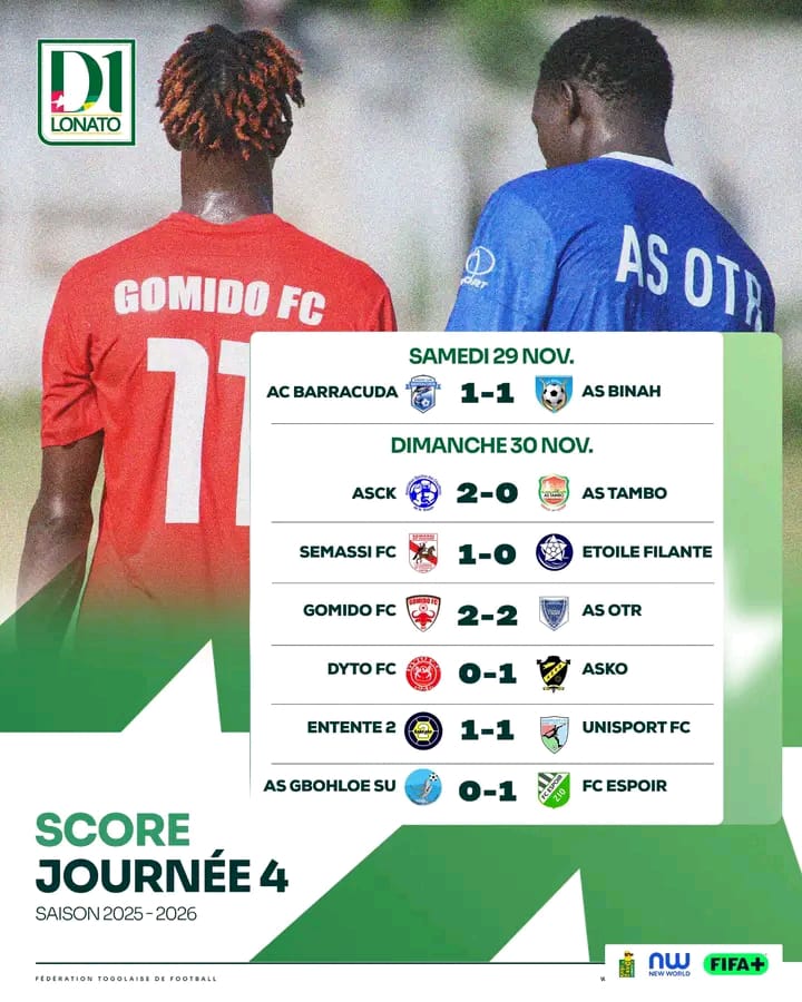 À Kpalimé, Gomido FC et l’AS OTR se sont séparés sur un nul spectaculaire (2-2). Menés à deux reprises, les Show Boys ont su revenir grâce à des buts d’Ametepe (70e) et Awoudji (85e), répondant à ceux d’Afatsawo (29e) et Amouvin (74e). Gomido devra encore patienter pour décrocher sa deuxième victoire.