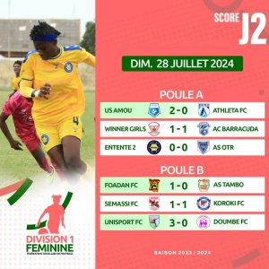 Dans la poule B, Unisport FC a écrasé Doumbé FC 3-0 tandis que Foadan FC a battu As Tambo à domicile 1-0. Semassi FC et Koroki FC se sont neutralisés avec un score de 1-1. Asko Féminine était exemptée de cette journée.