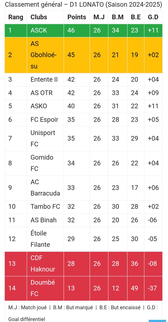 En bas de classement, le CDF Haknour (28 points) et Doumbé FC (13 points) sont les deux clubs relégués en D2 pour la saison prochaine.
