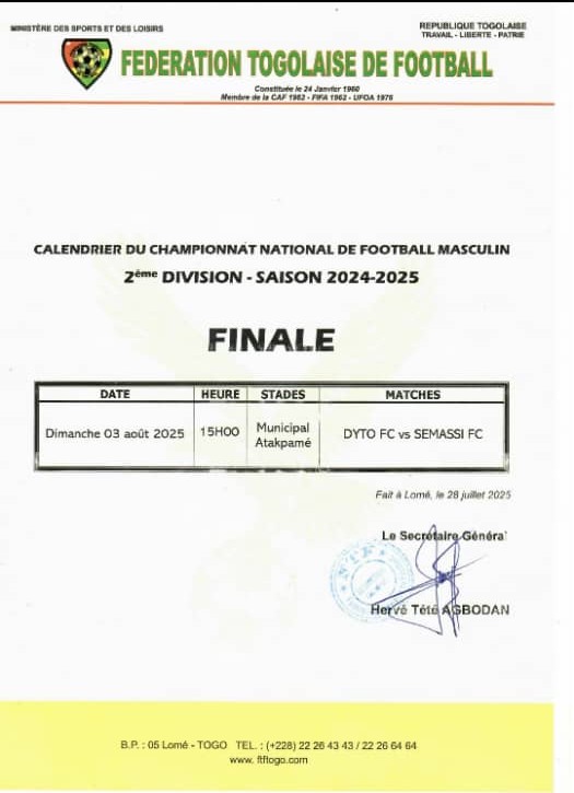 La finale du championnat national de deuxième division masculine pour la saison 2024-2025 se jouera ce dimanche 3 août 2025. DYTO FC, champion de la zone Sud, affrontera Semassi FC, qui a dominé la zone Nord.