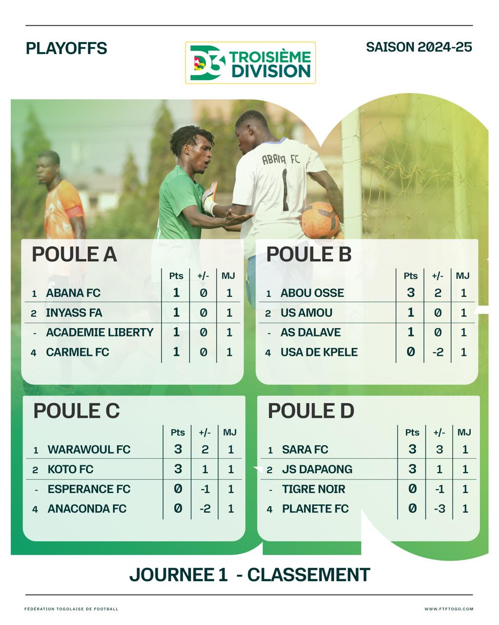 Les play-offs de la Troisième Division togolaise ont officiellement démarré ce mercredi 4 mars 2026 avec la première journée disputée.
