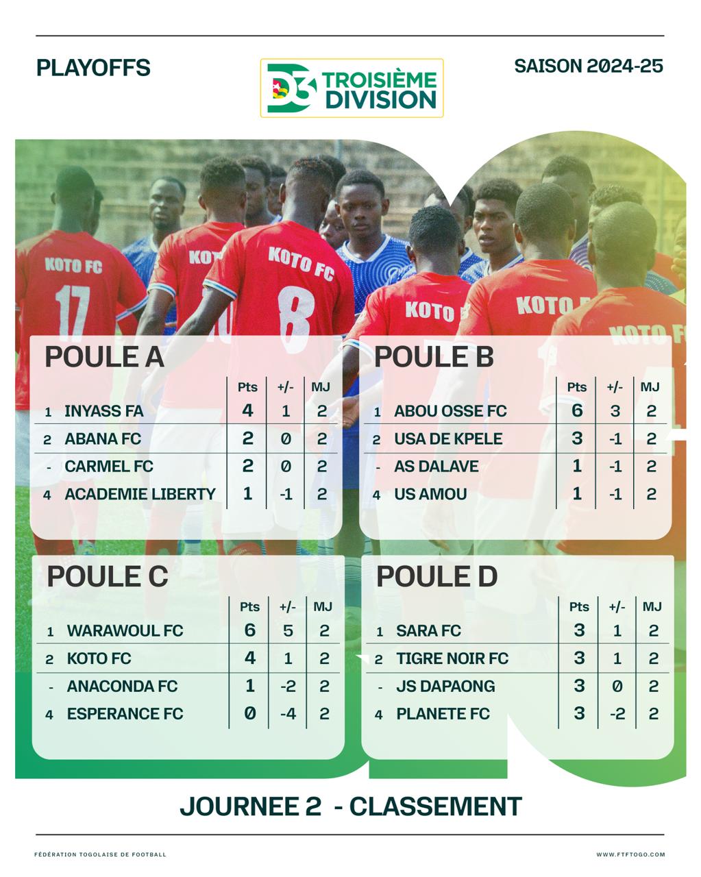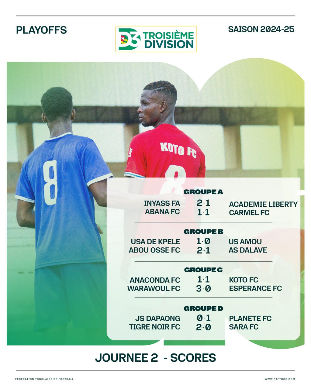 La deuxième journée des playoffs de la Troisième Division togolaise s’est jouée avec des résultats variés dans les différents groupes en lice pour la montée. Si certaines équipes commencent déjà à se démarquer, la bataille reste très disputée dans plusieurs poules après deux journées.