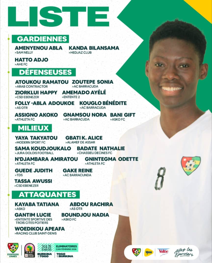 La sélectionneuse des Éperviers Dames, Kayi Tomety, a dévoilé ce jeudi 16 octobre 2025 la liste des joueuses retenues pour la double confrontation face au Burkina Faso, comptant pour le dernier tour des éliminatoires de la CAN Féminine Maroc 2026.
