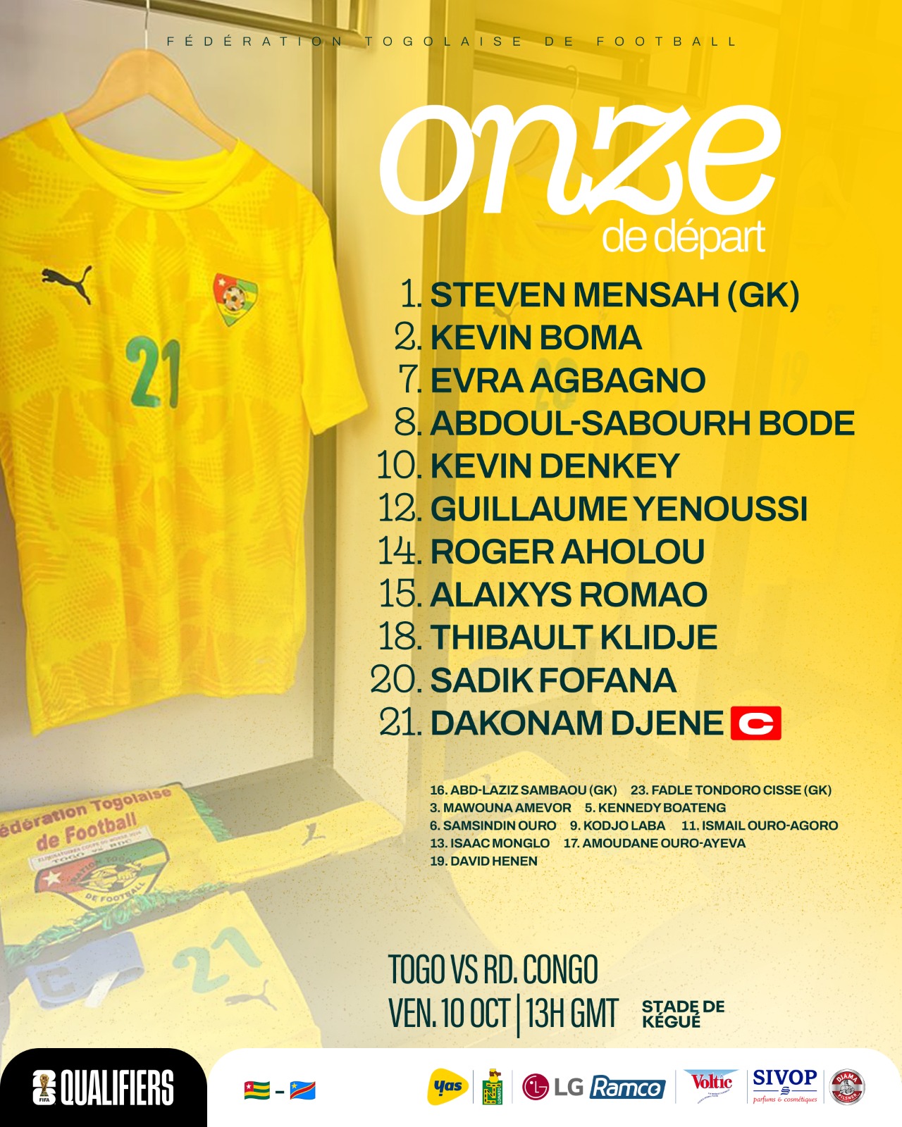 Voici les noms des onze entrants du Togo face à la RD Congo :