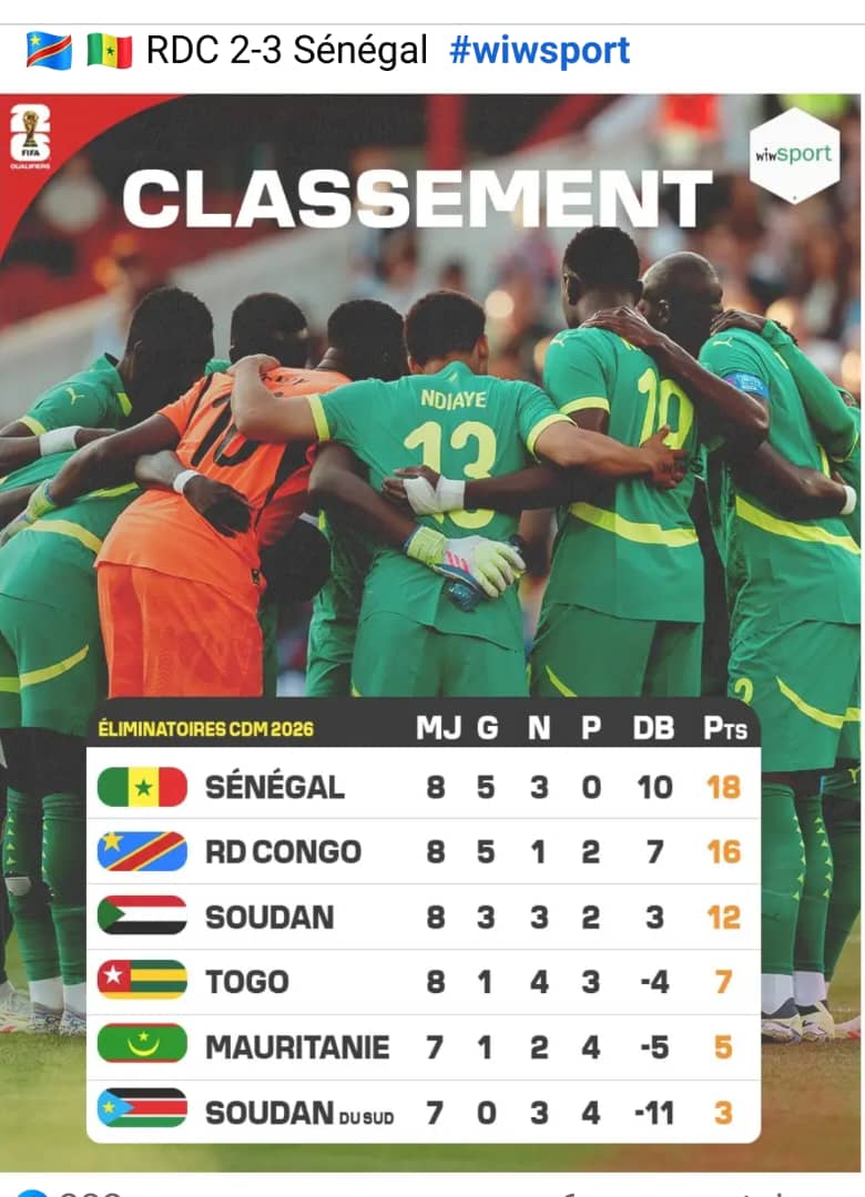 Dans l’autre match du groupe, c’est le Sénégal qui a pris le meilleur sur la RD Congo 3 buts à 0 après être mené 0-2. Les Lions de la Teranga sont à un pas de se qualifier pour la Coupe du Monde 2026.