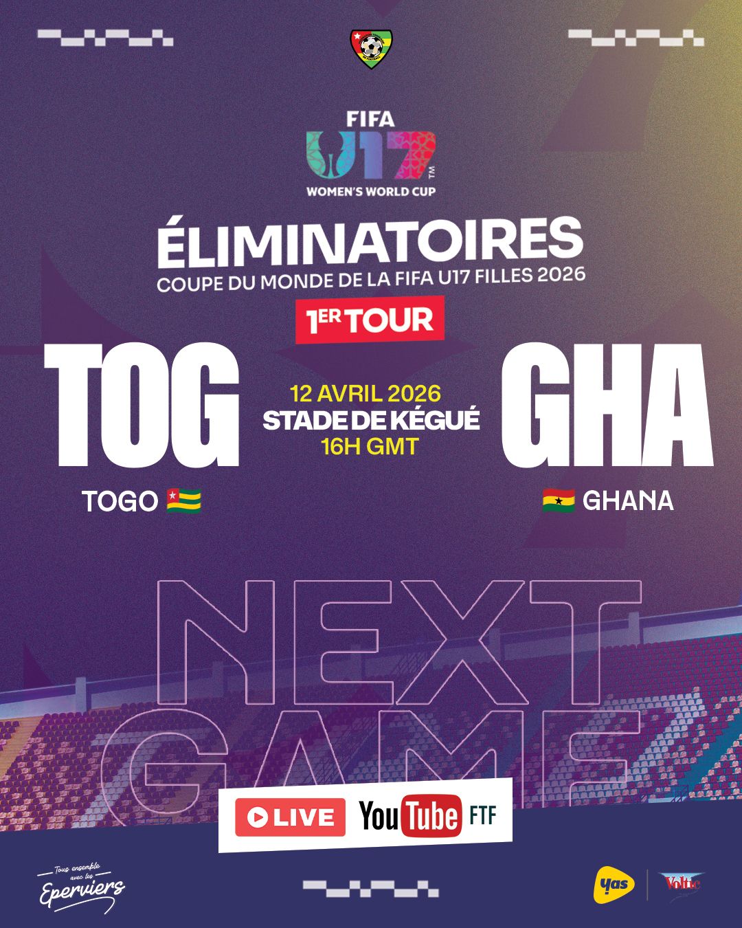 Les Éperviers U17 Filles du Togo reçoivent ce dimanche 12 avril 2026 au stade de Kégué à Lomé les Black Maidens du Ghana, dans le cadre du match aller des éliminatoires de la Coupe du Monde Féminine U17 2026 prévue au Maroc.