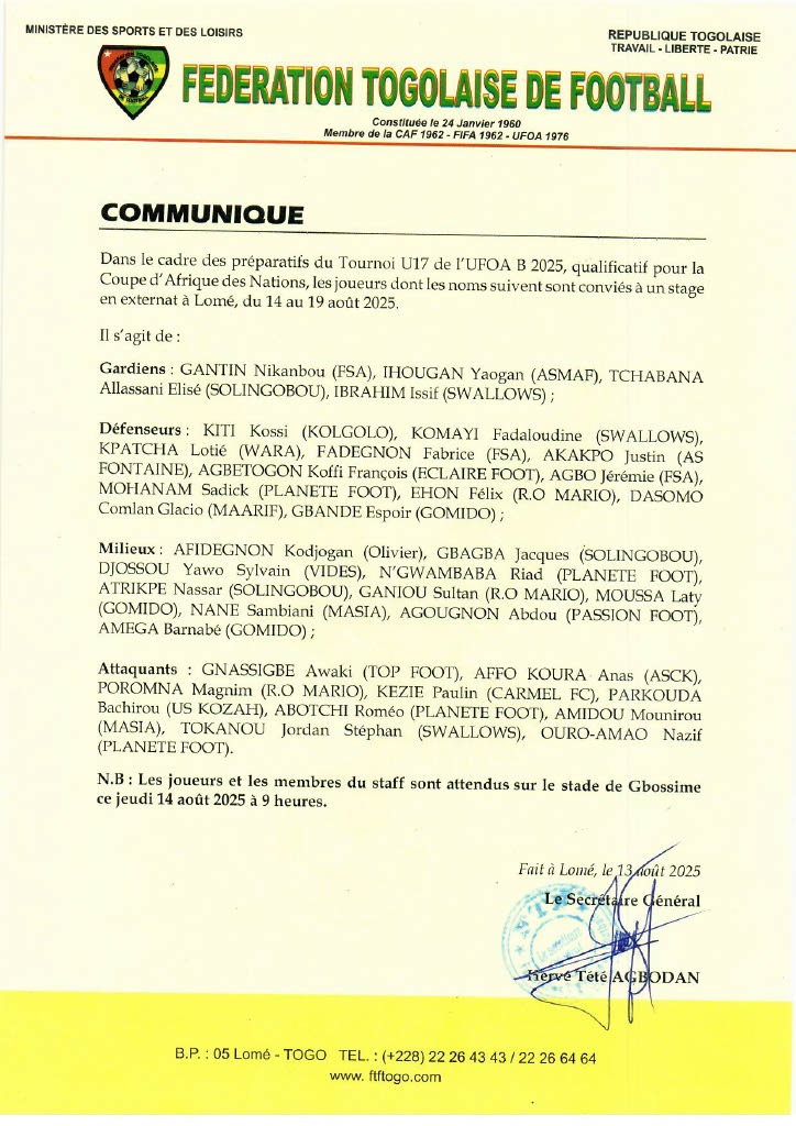 À noter que les joueurs convoqués sont attendus ce jeudi 14 août dès 09h00 au stade de Gbossimé.