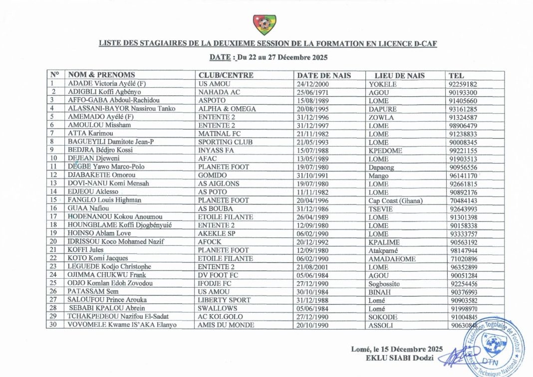 Après une première session réussie, la Fédération Togolaise de Football (FTF), à travers sa Direction Technique Nationale, lance une deuxième session de formation pour l’obtention de la Licence D-CAF, du 22 au 27 décembre 2025 à Lomé.