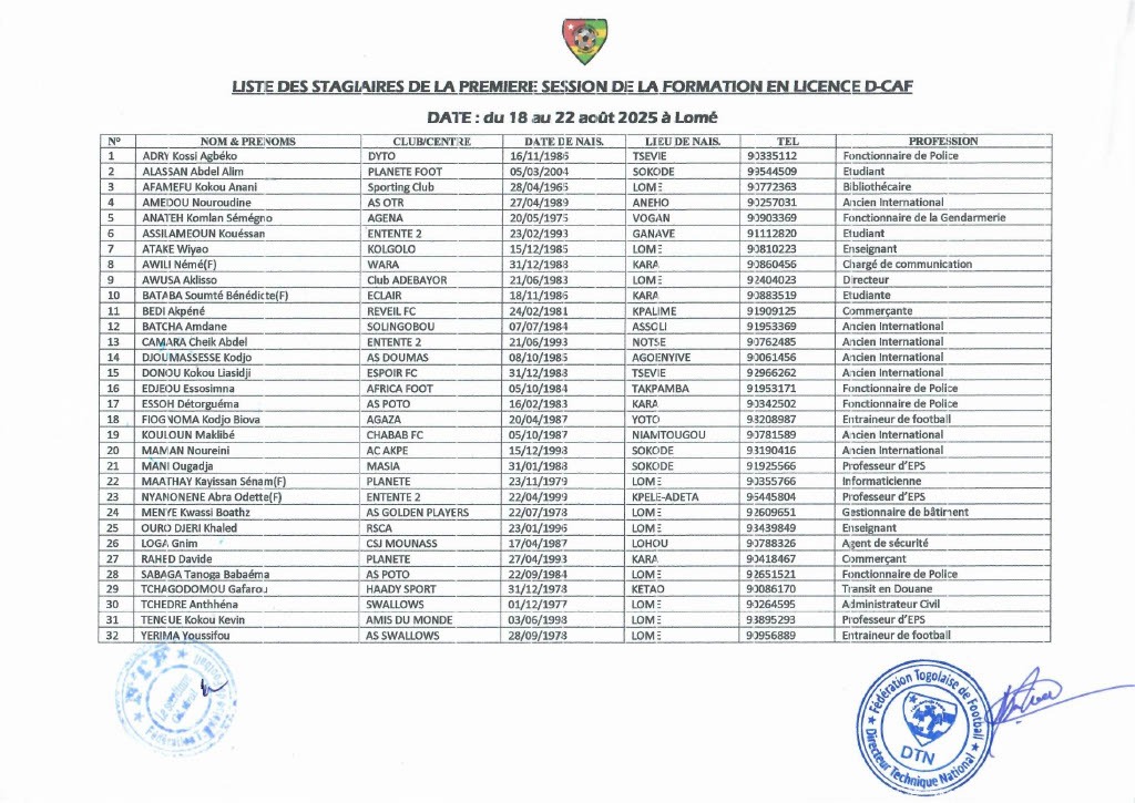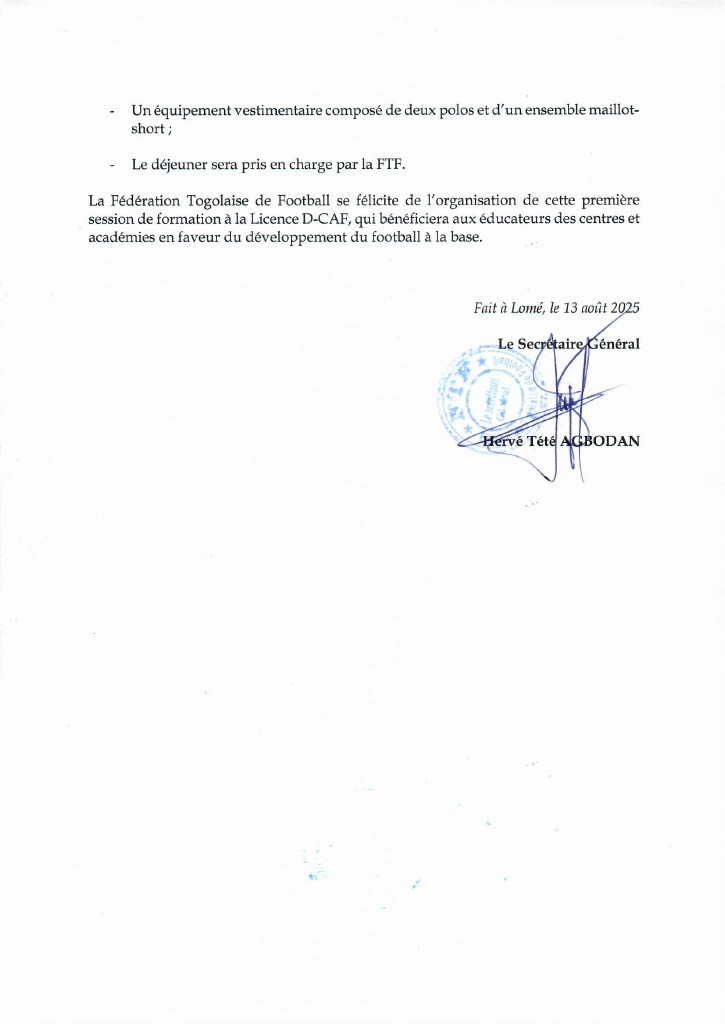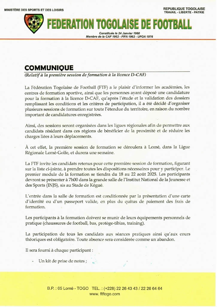 La Fédération Togolaise de Football (FTF) a annoncé ce vendredi 15 août 2025 via une note signée du secrétaire Général de la FTF, Hervé Tété AGBODAN, le début de la formation pour la Licence D CAF.
