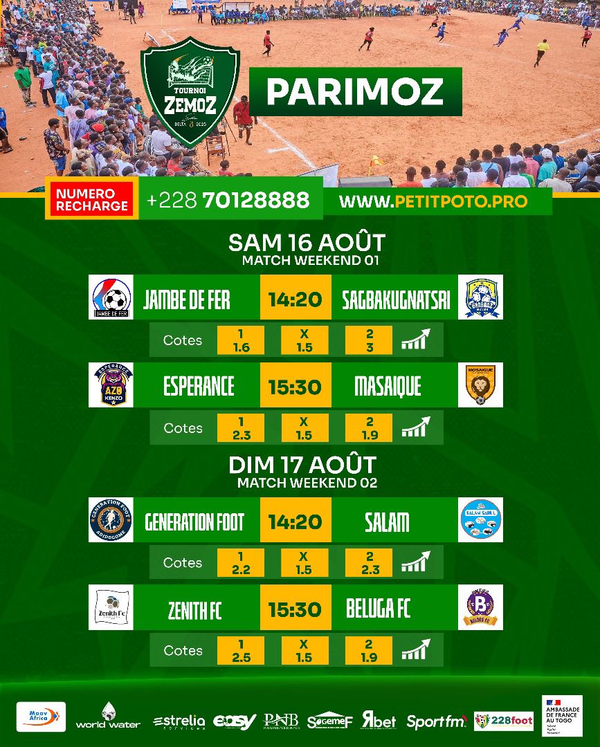 Les quarts de finale du Tournoi Zemoz 2025 ont débuté ce samedi 16 août sur le terrain du Lycée Tokoin Solidarité, avec deux affiches âprement disputées sous les yeux d’un public venu nombreux.
